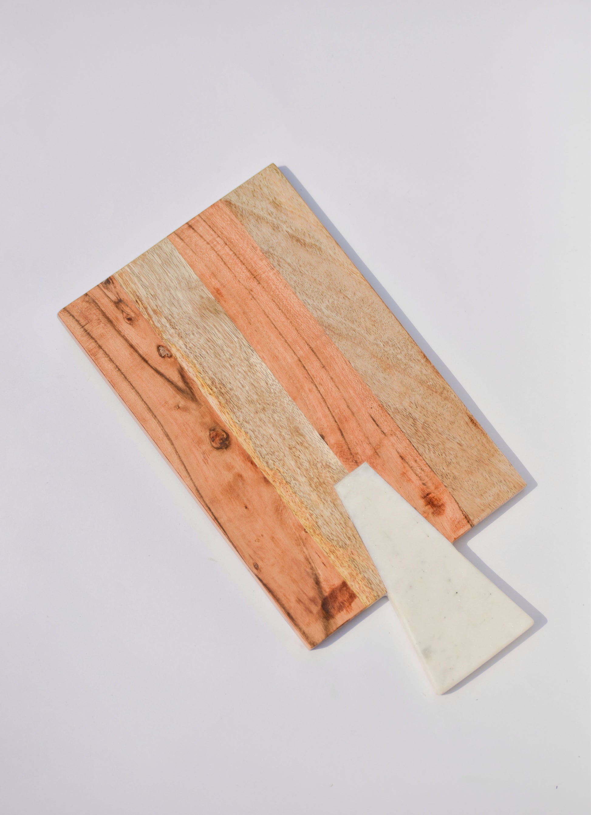 Tray Platter by The Modern Storey. Elevate your dining with this stunning brown cheese platter, perfect for parties and small get-togethers. Skillfully crafted from white banswara marble, mango, and acacia wood, it combines elegance with functionality for a stylish presentation.