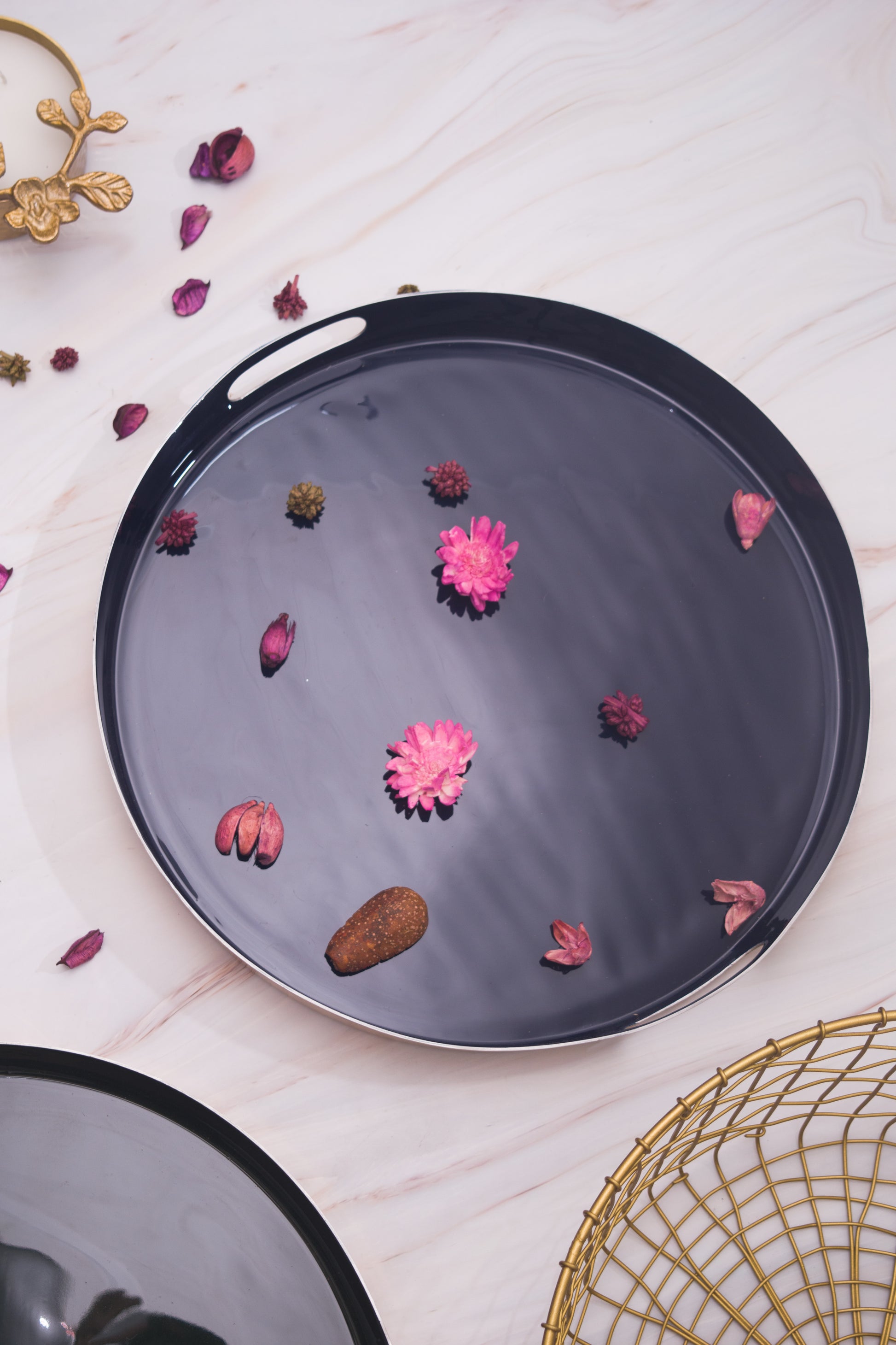Tray Platter by The Modern Storey. Elevate your dining table with this stunning round tray in navy blue. Crafted from stainless steel and enamel, it adds a glossy touch of elegance, making it the perfect gift for your loved ones.