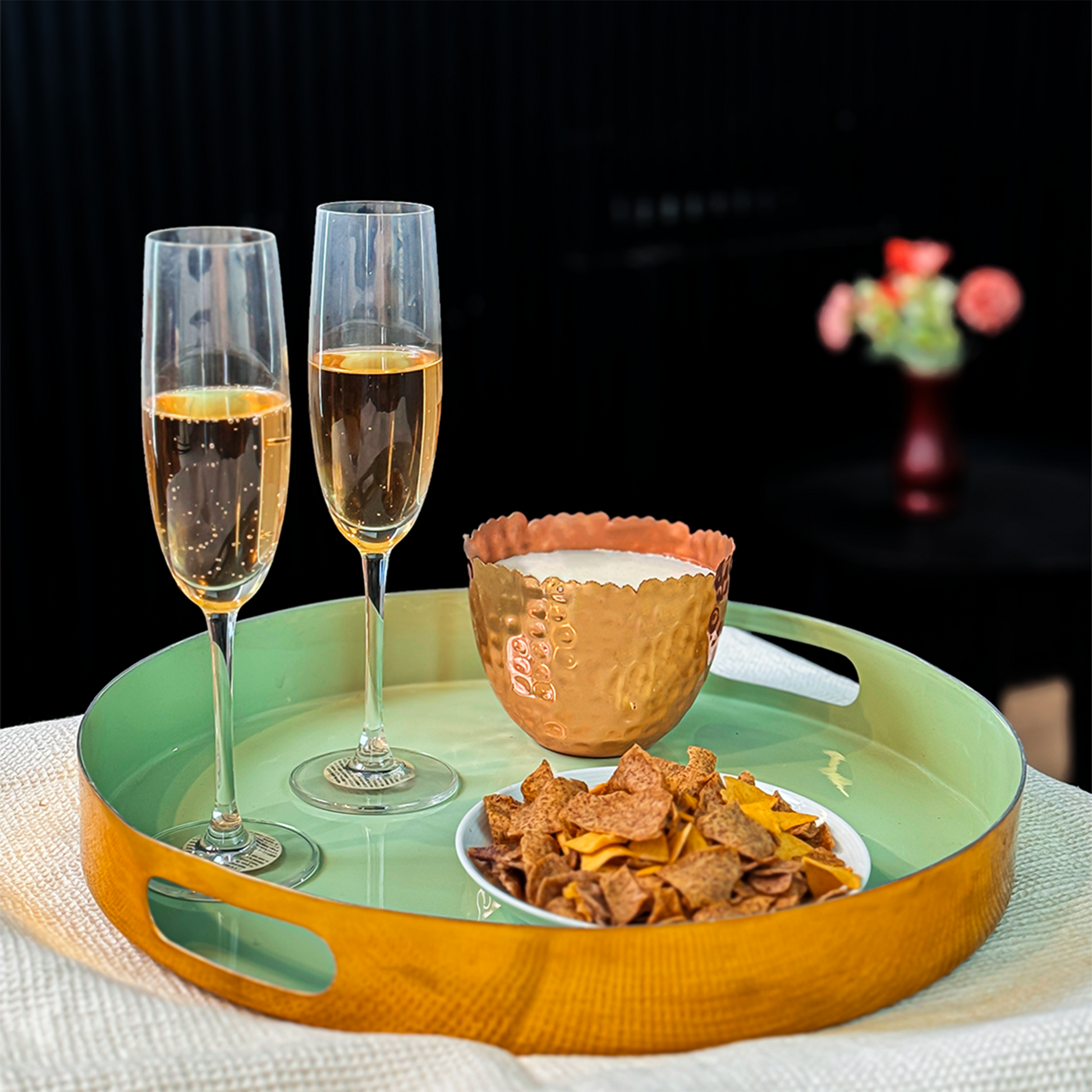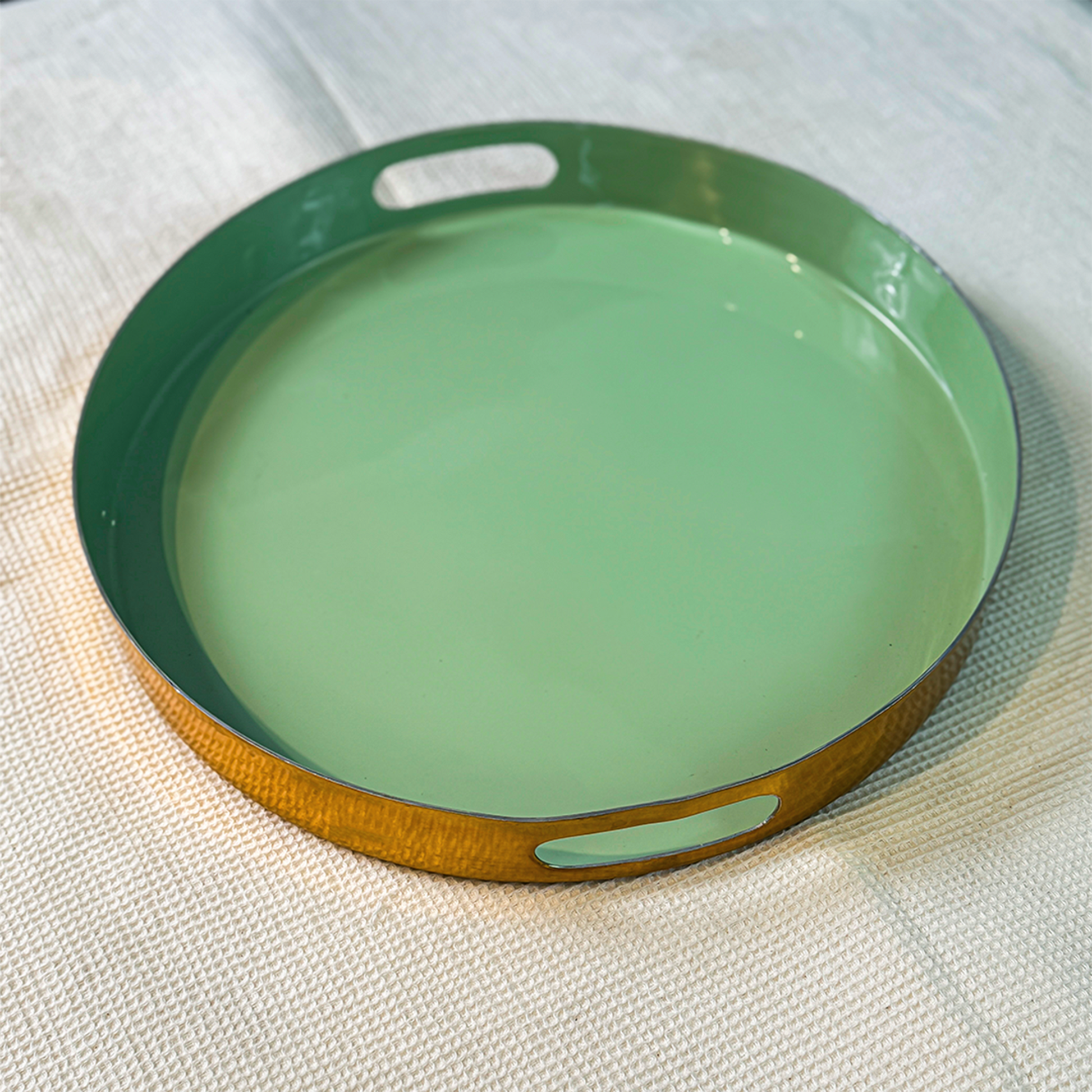 Tray Platter by The Modern Storey. Elevate your dining experience with this stunning pastel green round tray. Crafted from glossy stainless steel and enamel, it adds a touch of elegance to your table. Ideal for gifting to your loved ones.