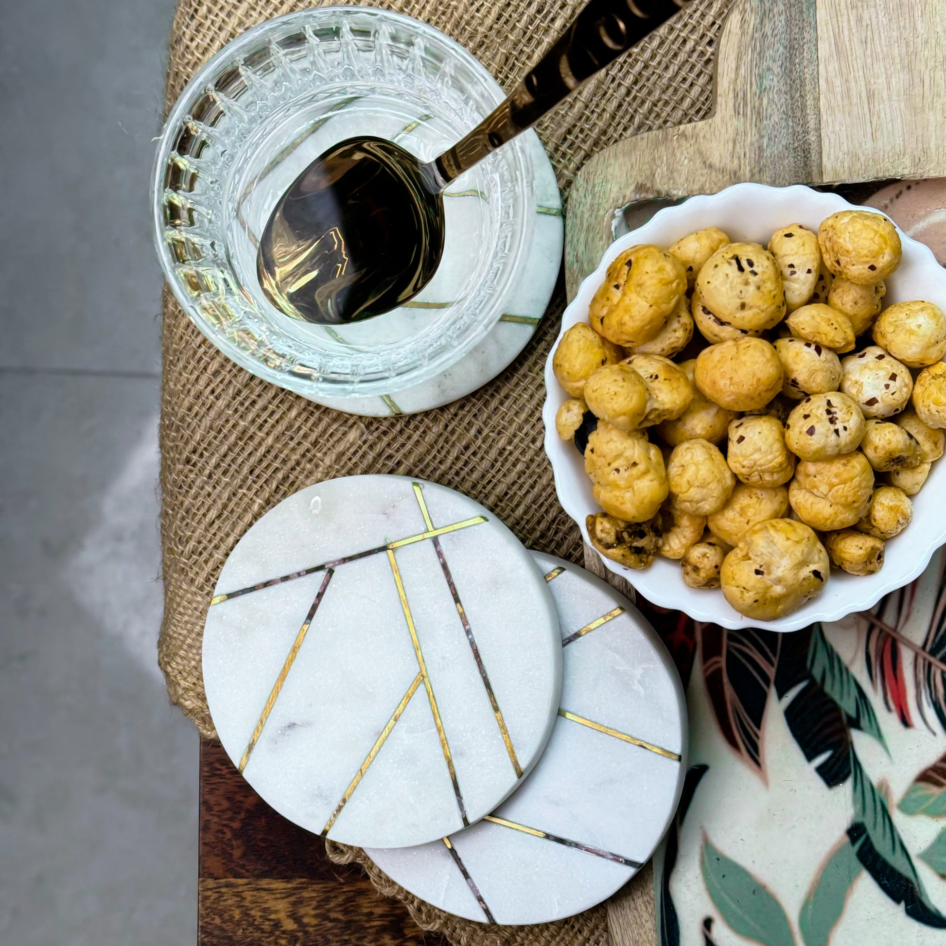 Marble Coasters by The Modern Storey. This set of 4 round white marble coasters features exquisite golden brass strips. Not just practical, but a stylish addition to protect surfaces with a touch of modern luxury.