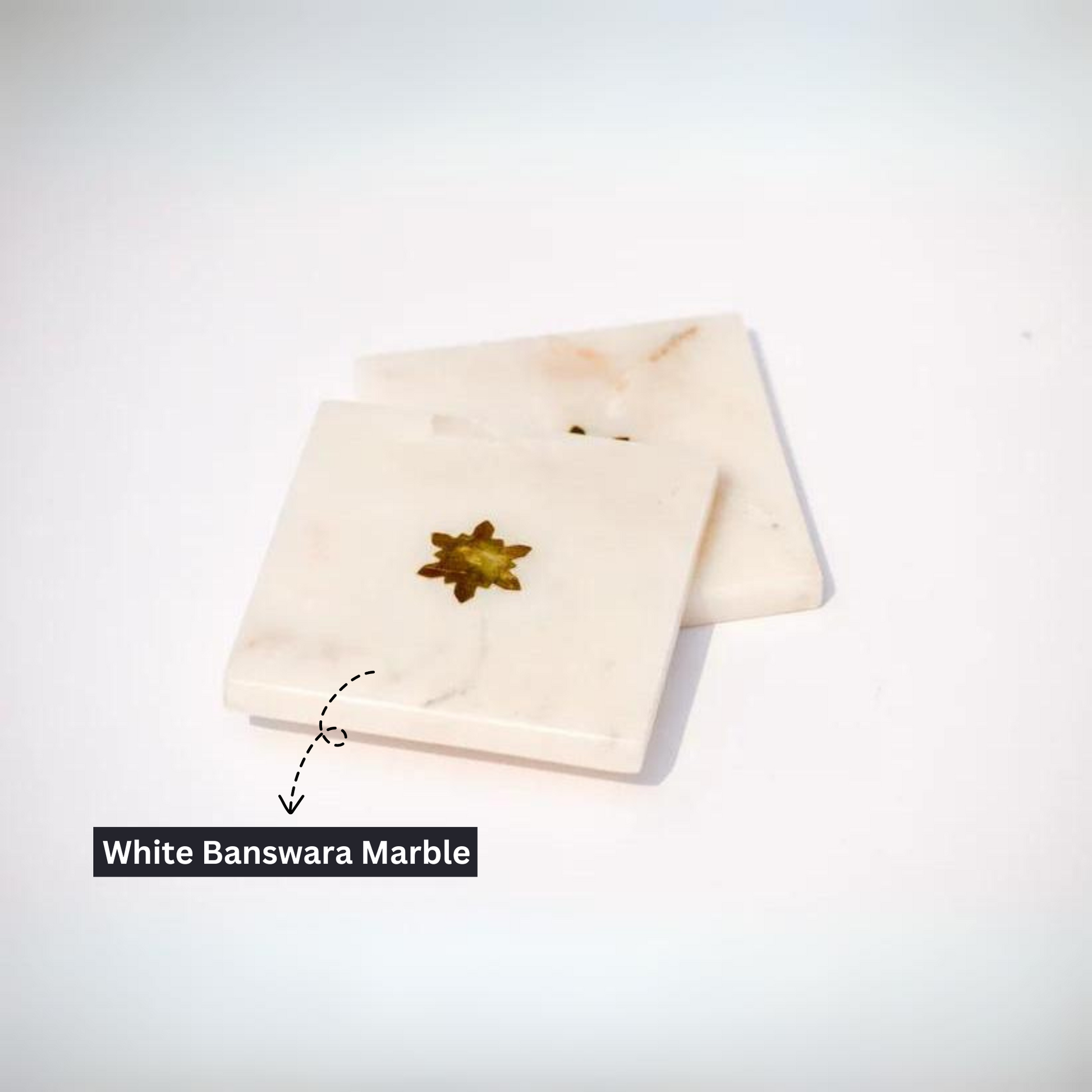 Marble Coasters by The Modern Storey. Elevate your decor with this set of four white and gold coasters, crafted from natural white banswara marble and brass. These square-shaped coasters add a touch of elegance while protecting the surfaces of your bar counter, dining table, office, or bedside.